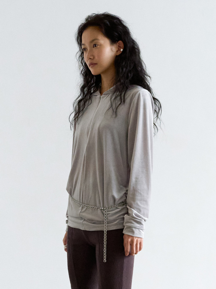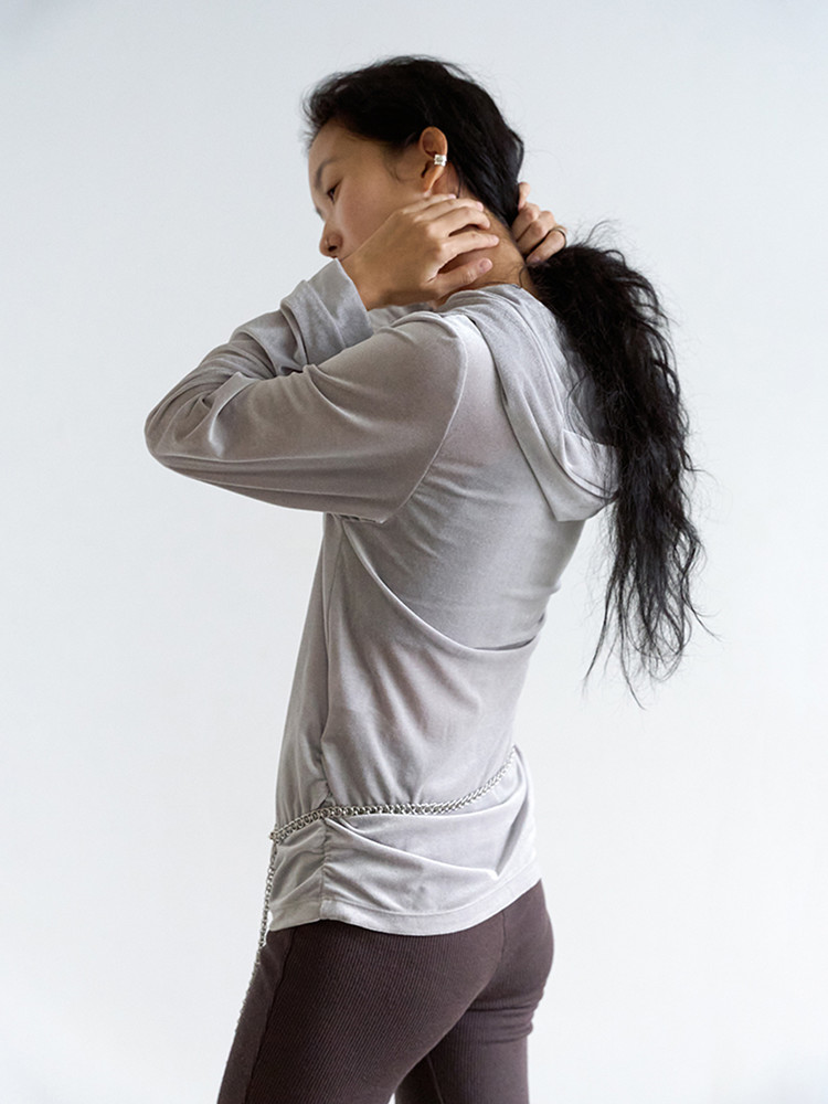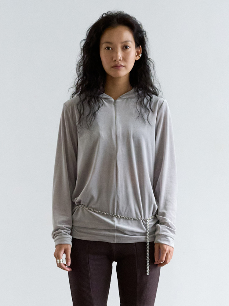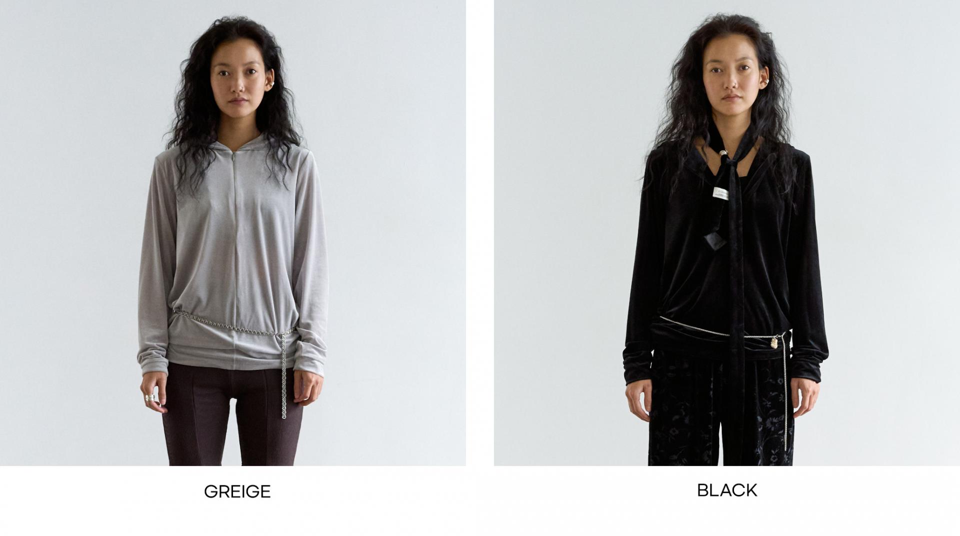 우아하고 세련된 인상을 주는 벨벳 원단에 후드와 집업 등의 캐주얼한 디테일을 더한 유니크한 탑입니다. 가슴 부분까지 내릴 수 있는 반집업 디자인으로 레이어드 스타일링에 활용하기 좋습니다. 스포티하면서도 페미닌한 무드를 선호하시는 분들에게 추천드립니다.