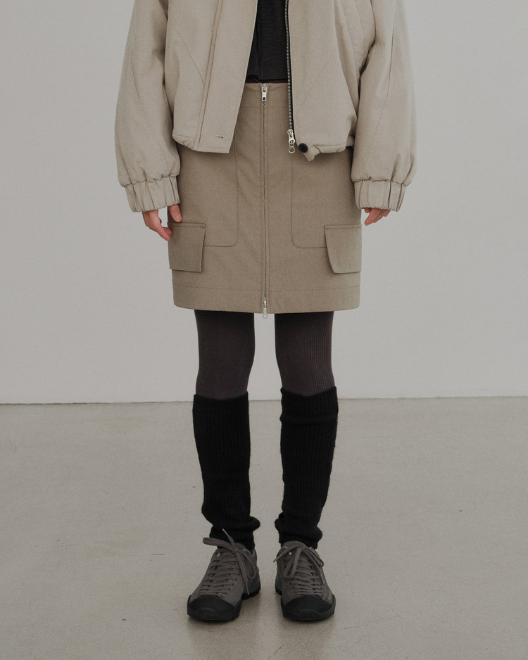 앞 여밈은 지퍼로 구성되어 있습니다. 다양한 스타일링과 활용을 위해 지퍼는 양방향으로 오픈할 수 있는 투웨이지퍼(일본 YKK사)를 사용했습니다. 지퍼를 허리에서 밑단까지 채워 숏 스커트로 착용할 수 있으며, 지퍼의 아랫부분을 열어 다른 의류 위에 덧 치마로 착용할 수 있습니다.