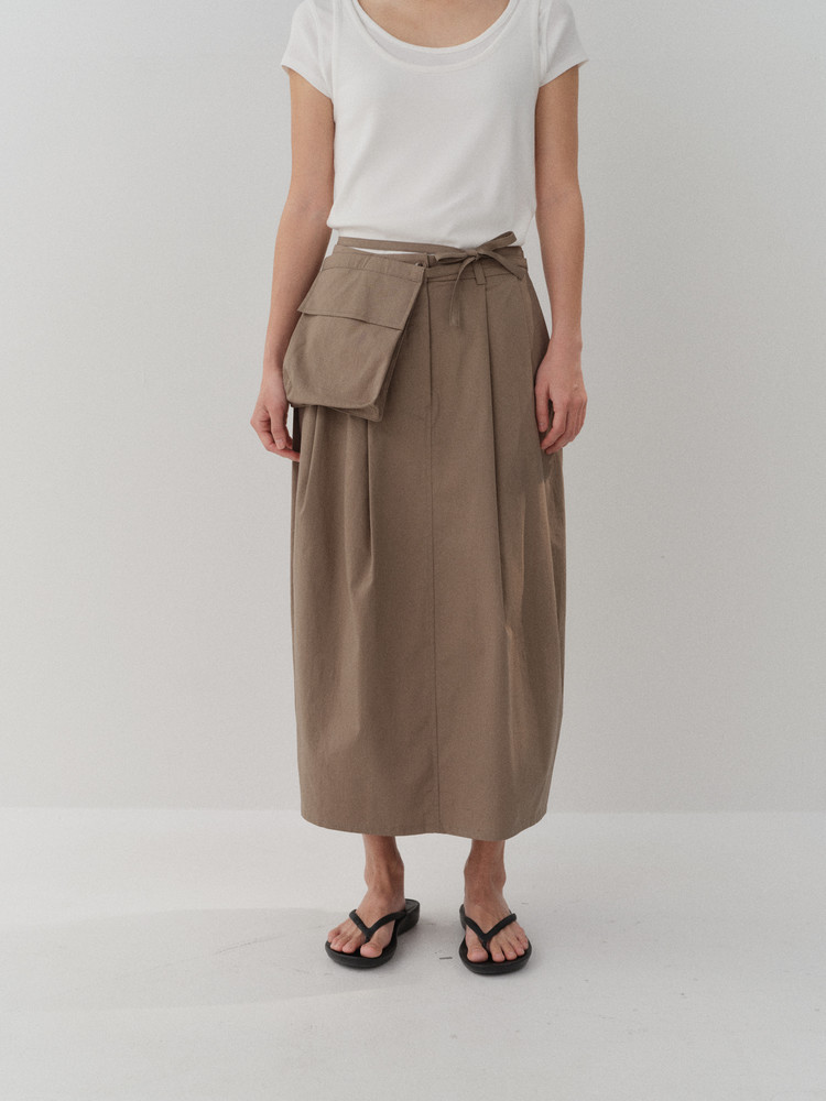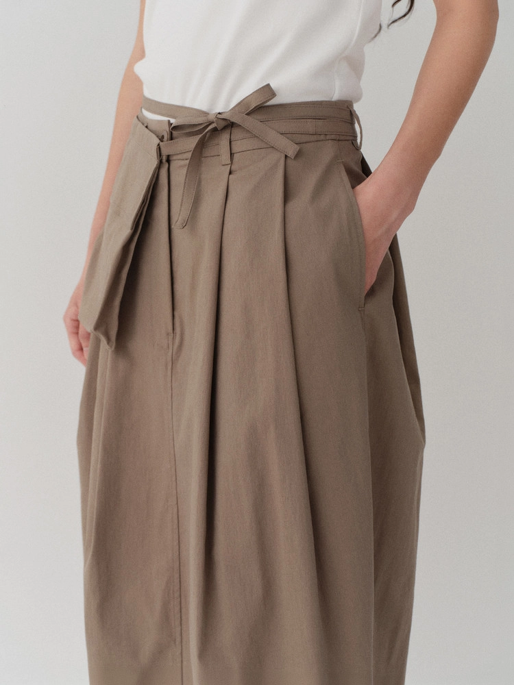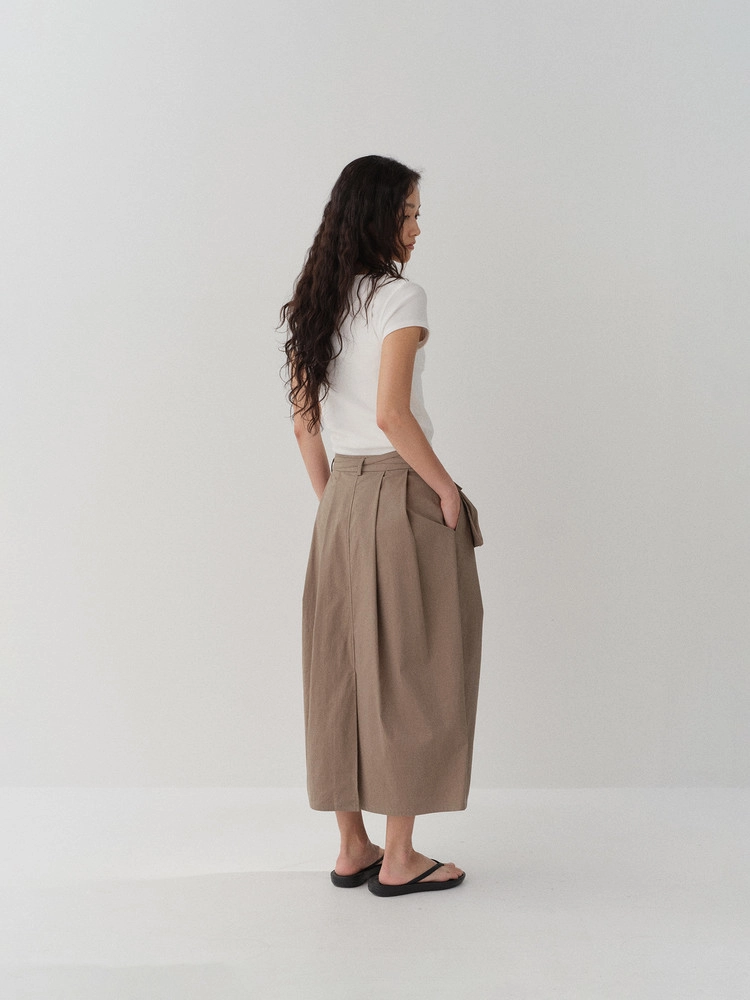 앞면과 뒷면에 깊은 턱이 있어 힙의 여유가 충분하며 아래로 갈수록 형태가 좁아드는 코쿤 실루엣 스커트입니다.