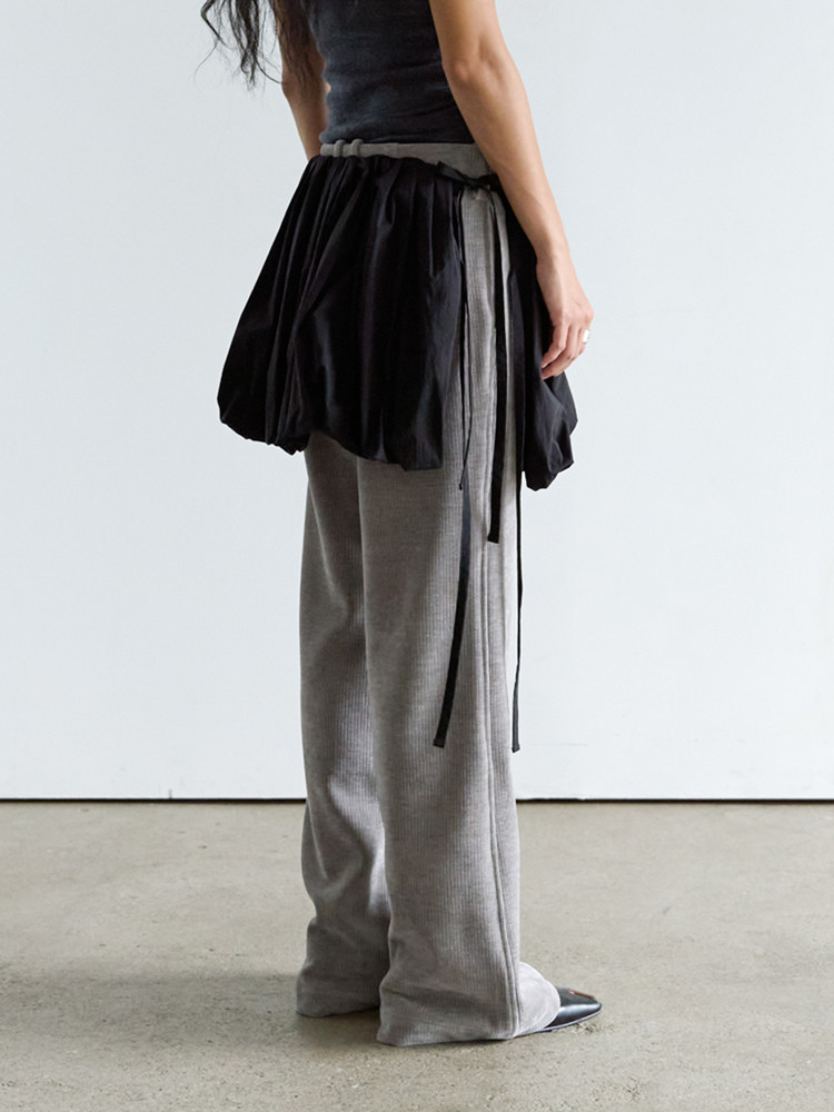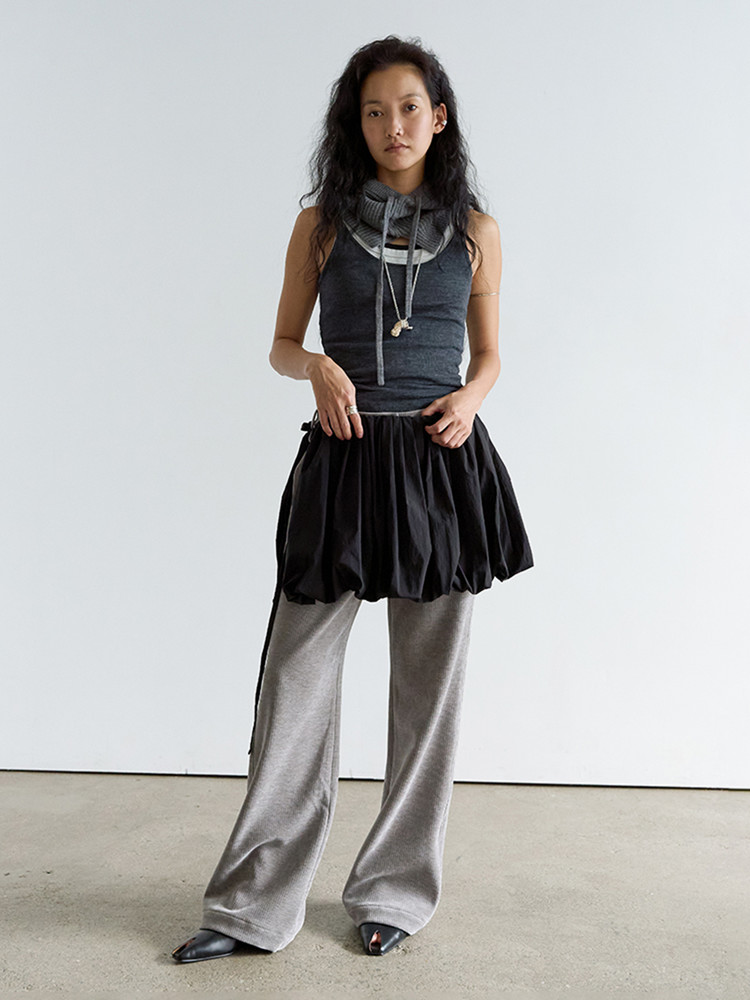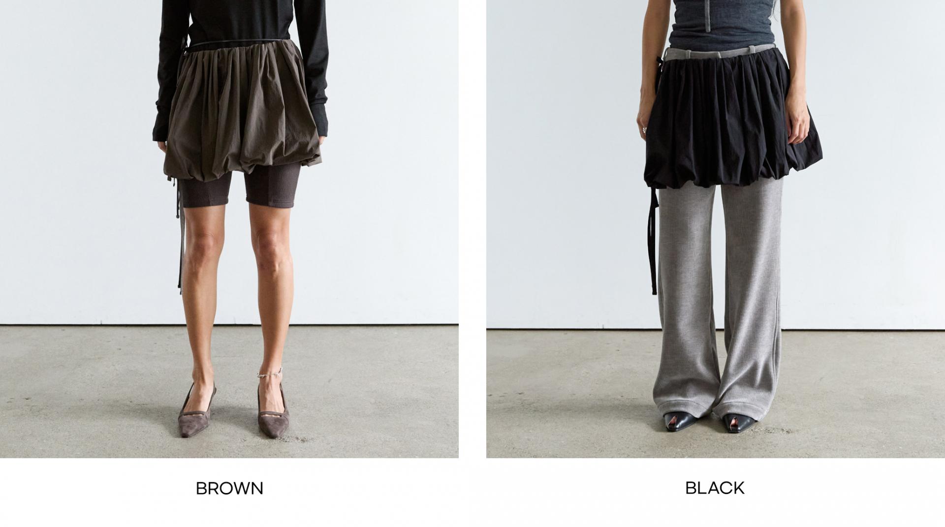 또한 완전히 오픈되는 형태의 이 스커트는 양 끝에 달린 끈으로 조여 착용할 수 있으며, 2단으로 달린 끈이 더욱 스타일리시한 느낌을 더해줍니다.