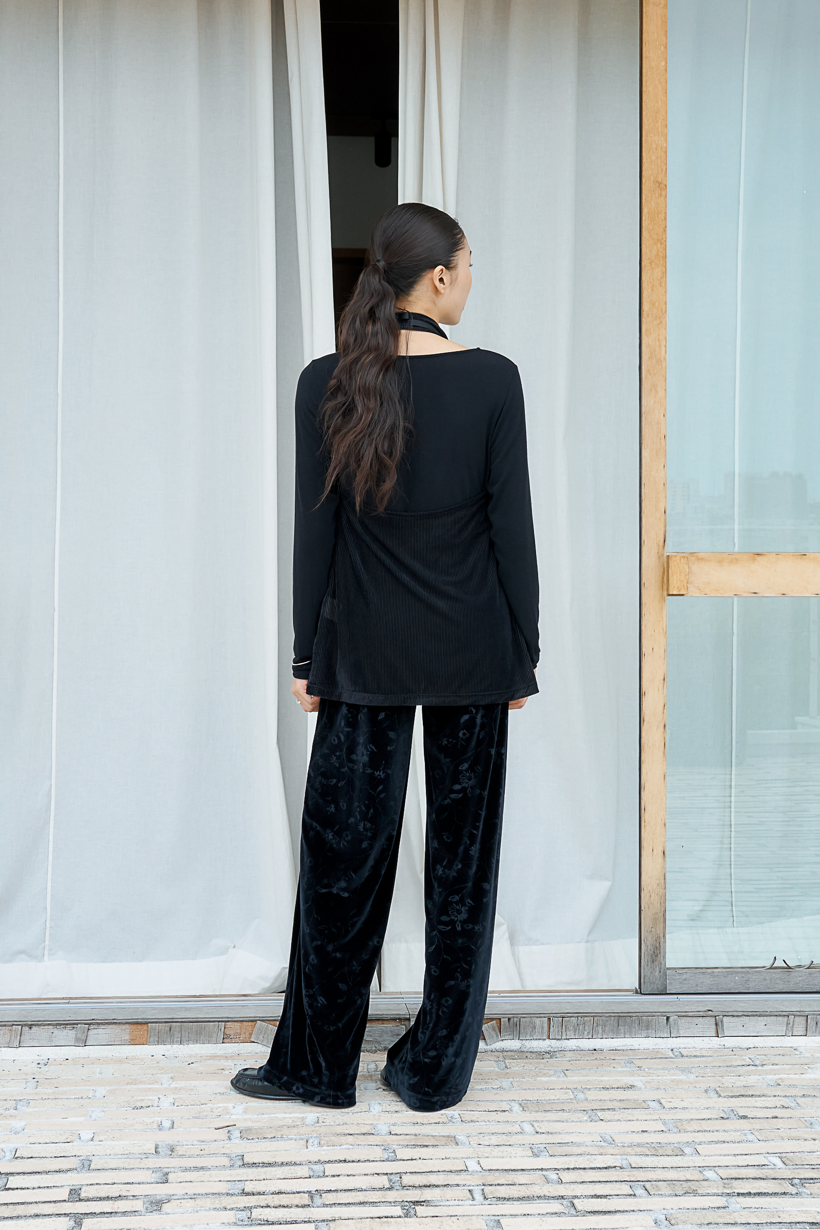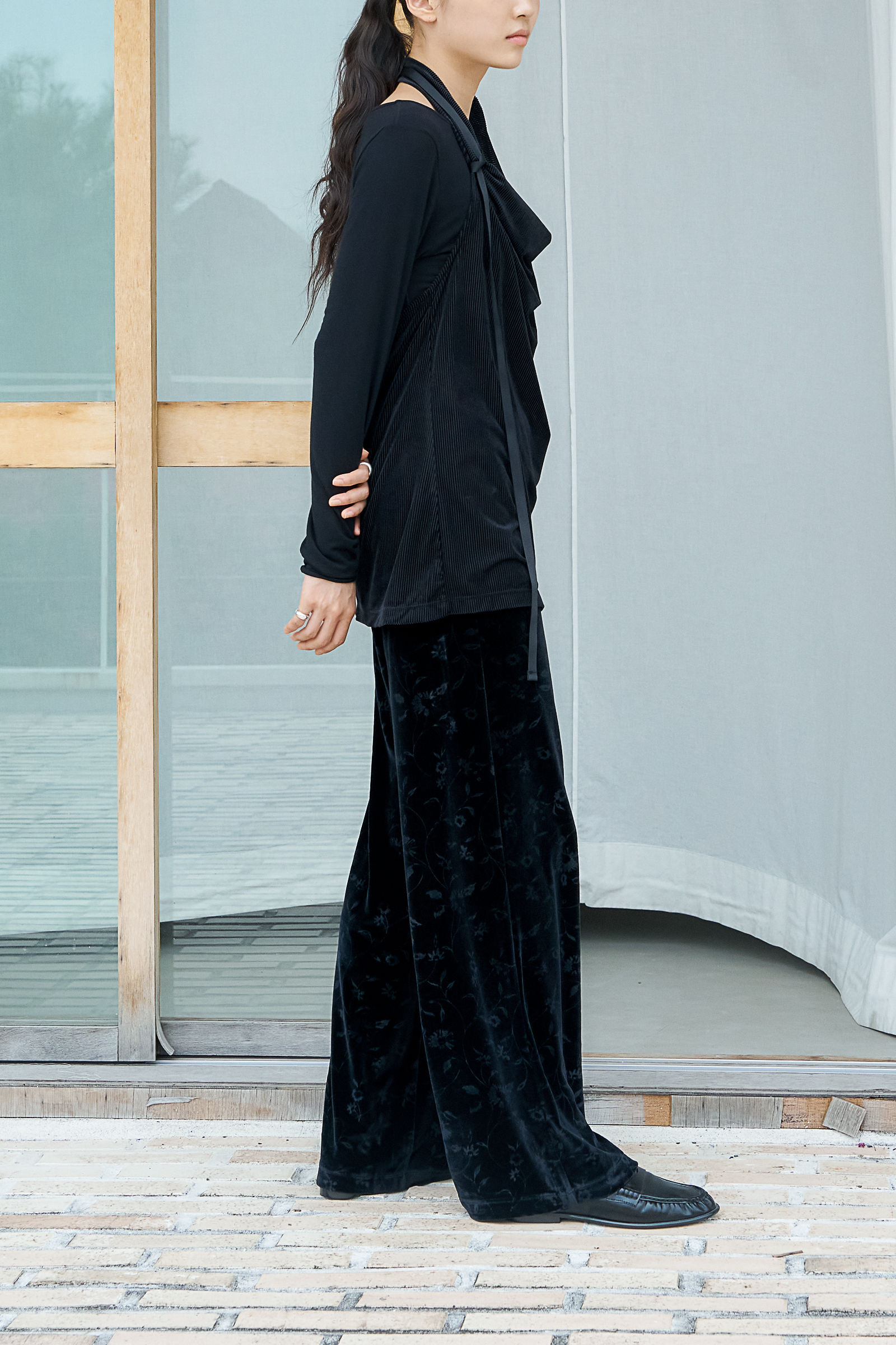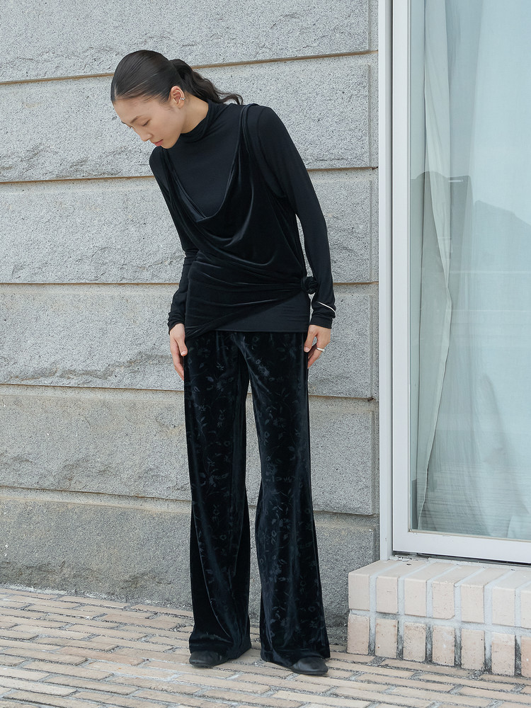 블랙 벨벳 특성상 이염이 있을 수 있습니다. 밝은 색 이너와 함께 착용하시기 전, 안심하고 입으실 수 있도록 2회 이상 단독 세탁해 주세요.