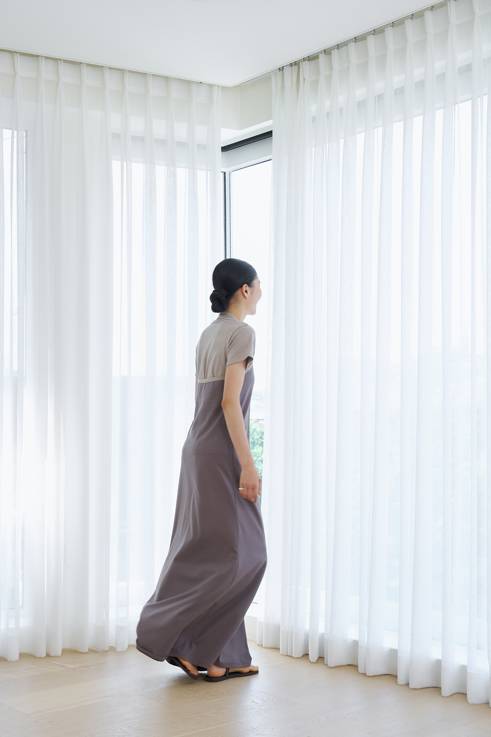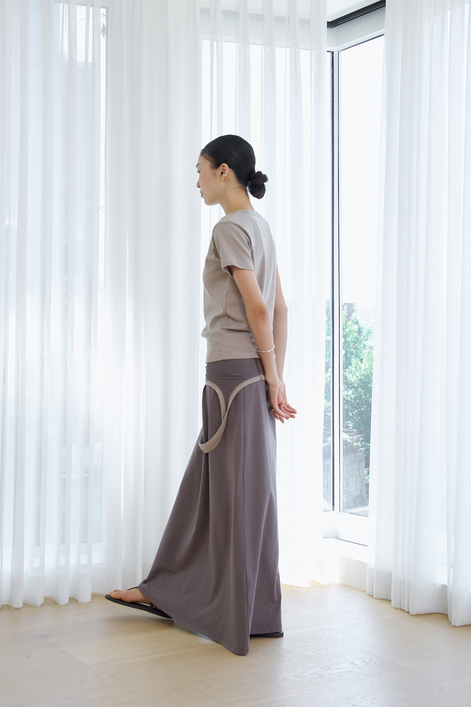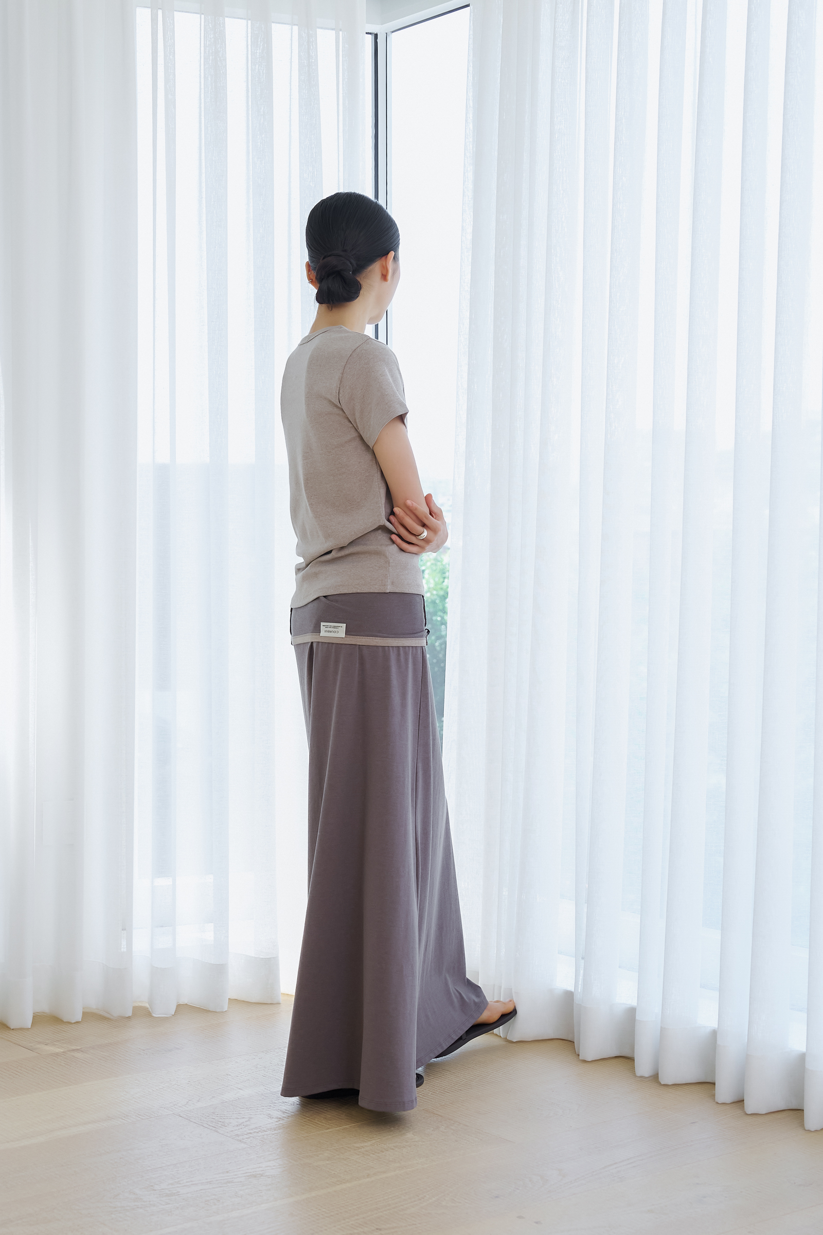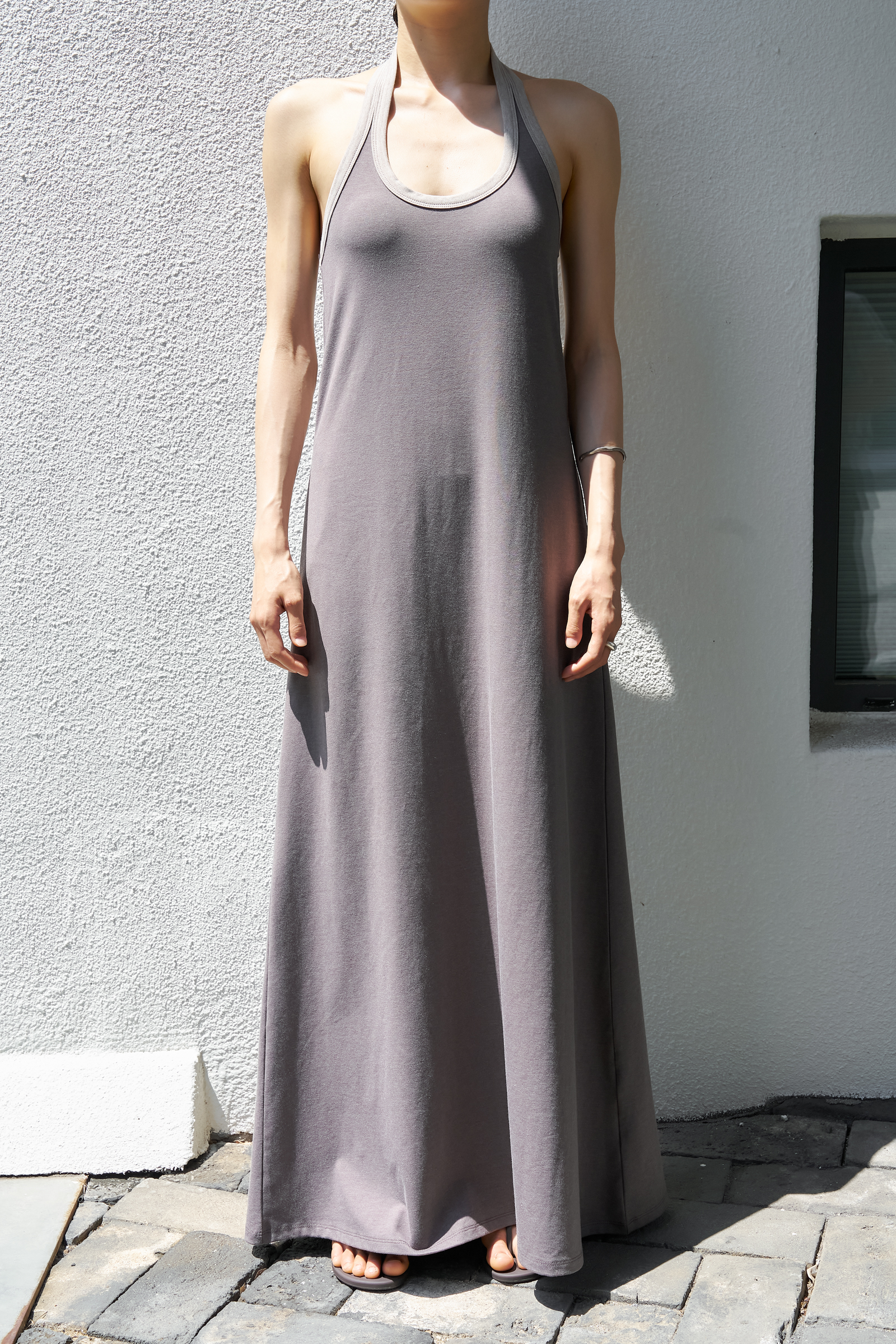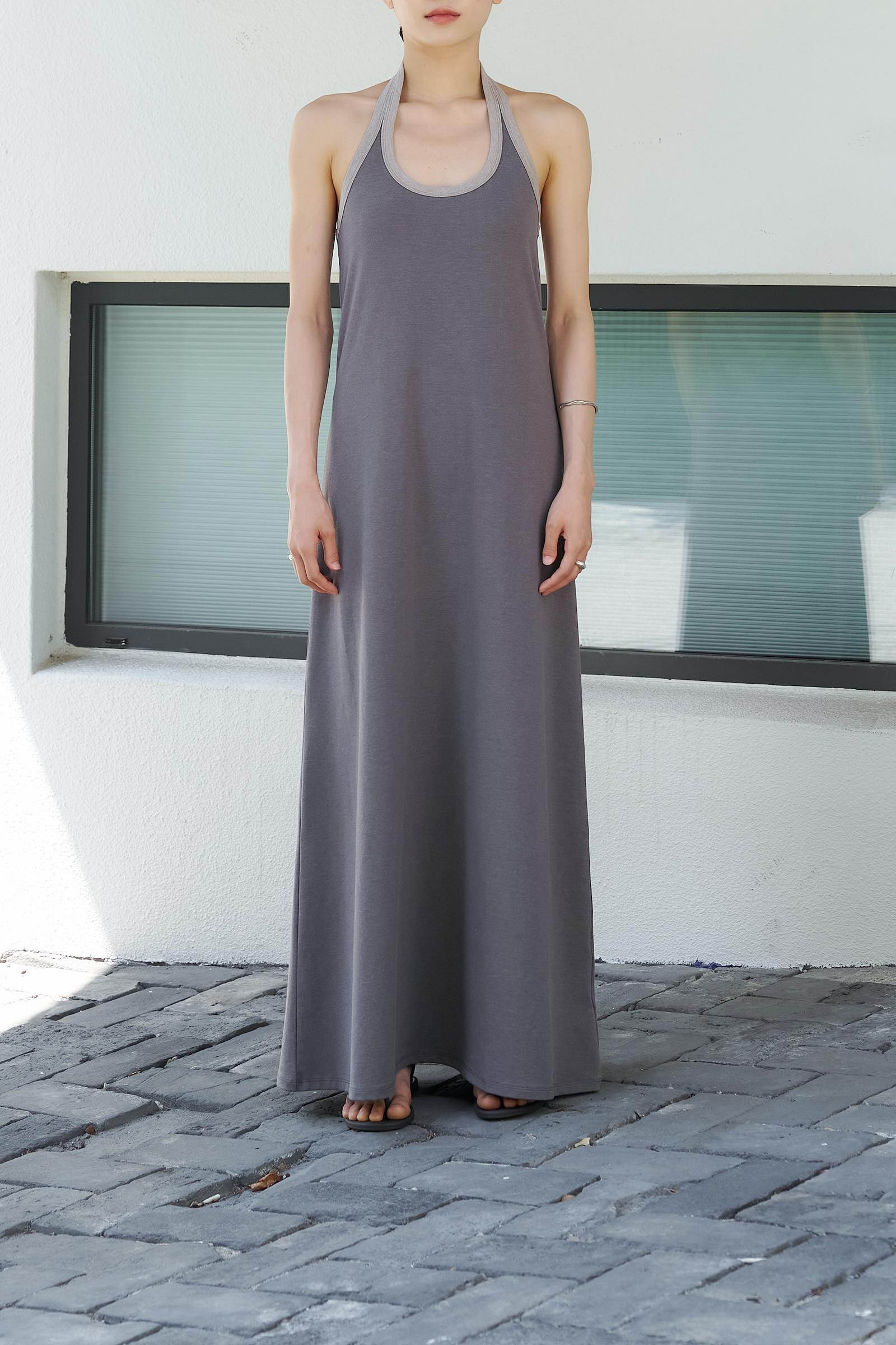 가슴을 감싸며, A라인으로 흐르는 긴 실루엣