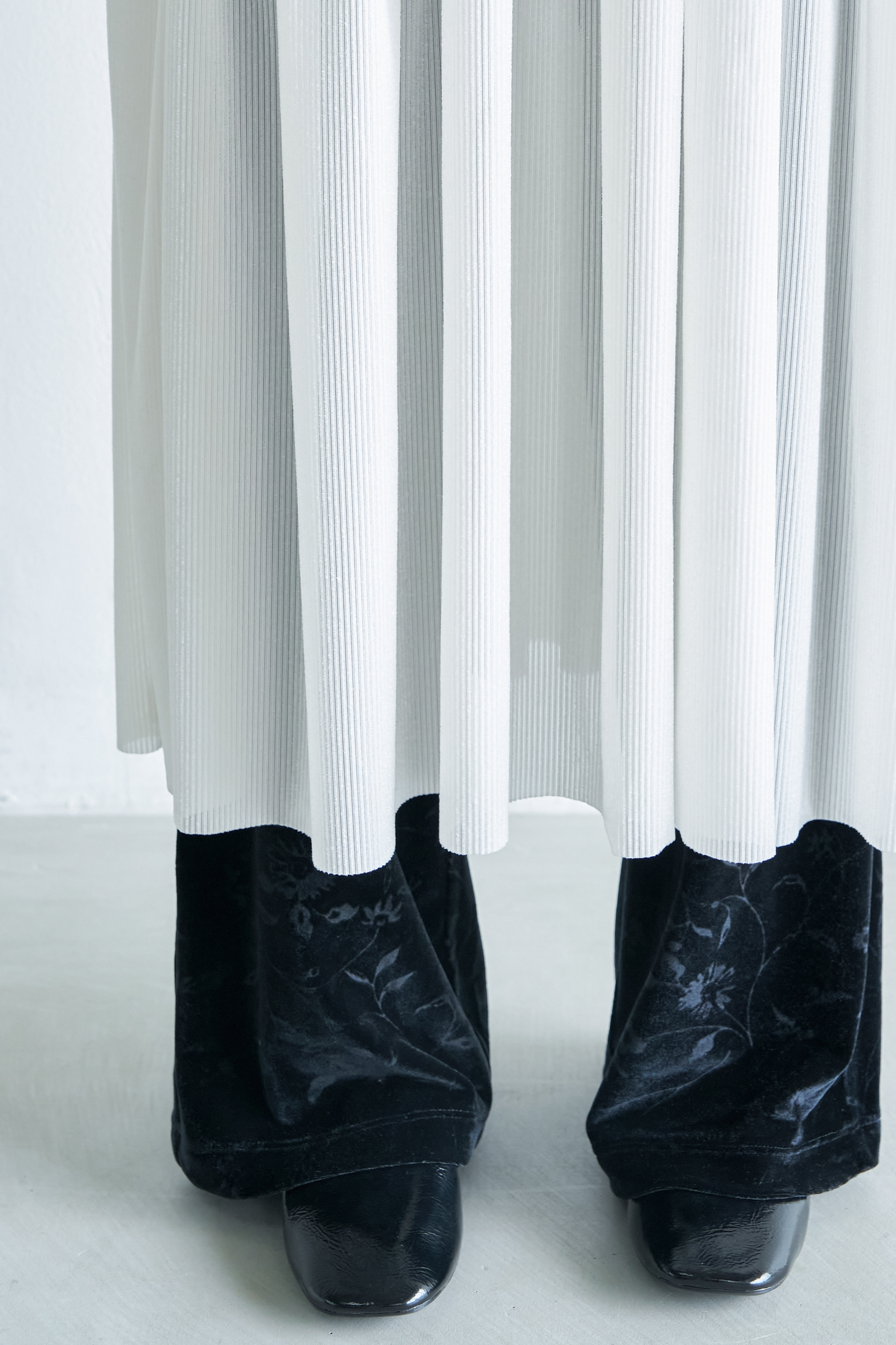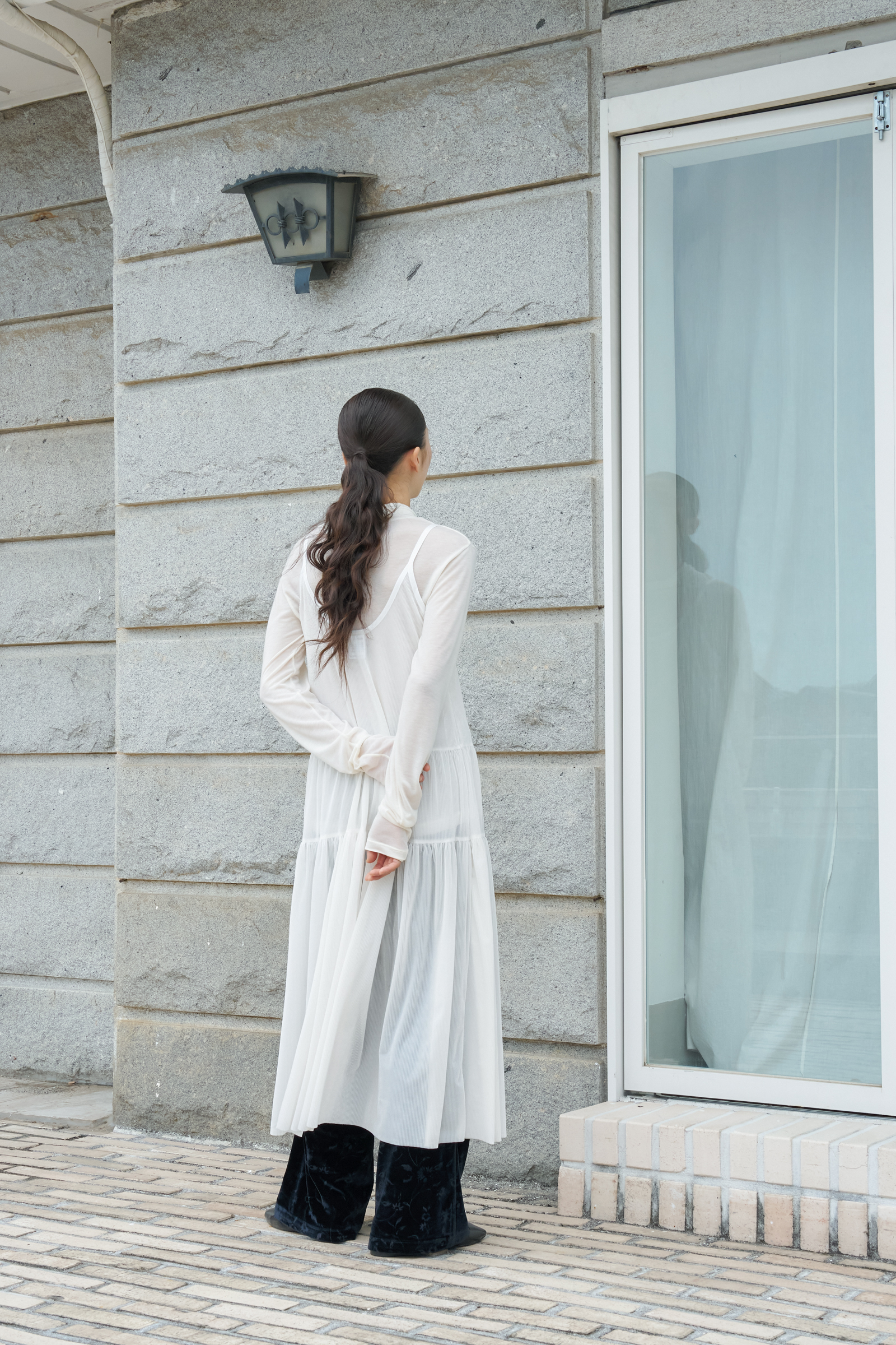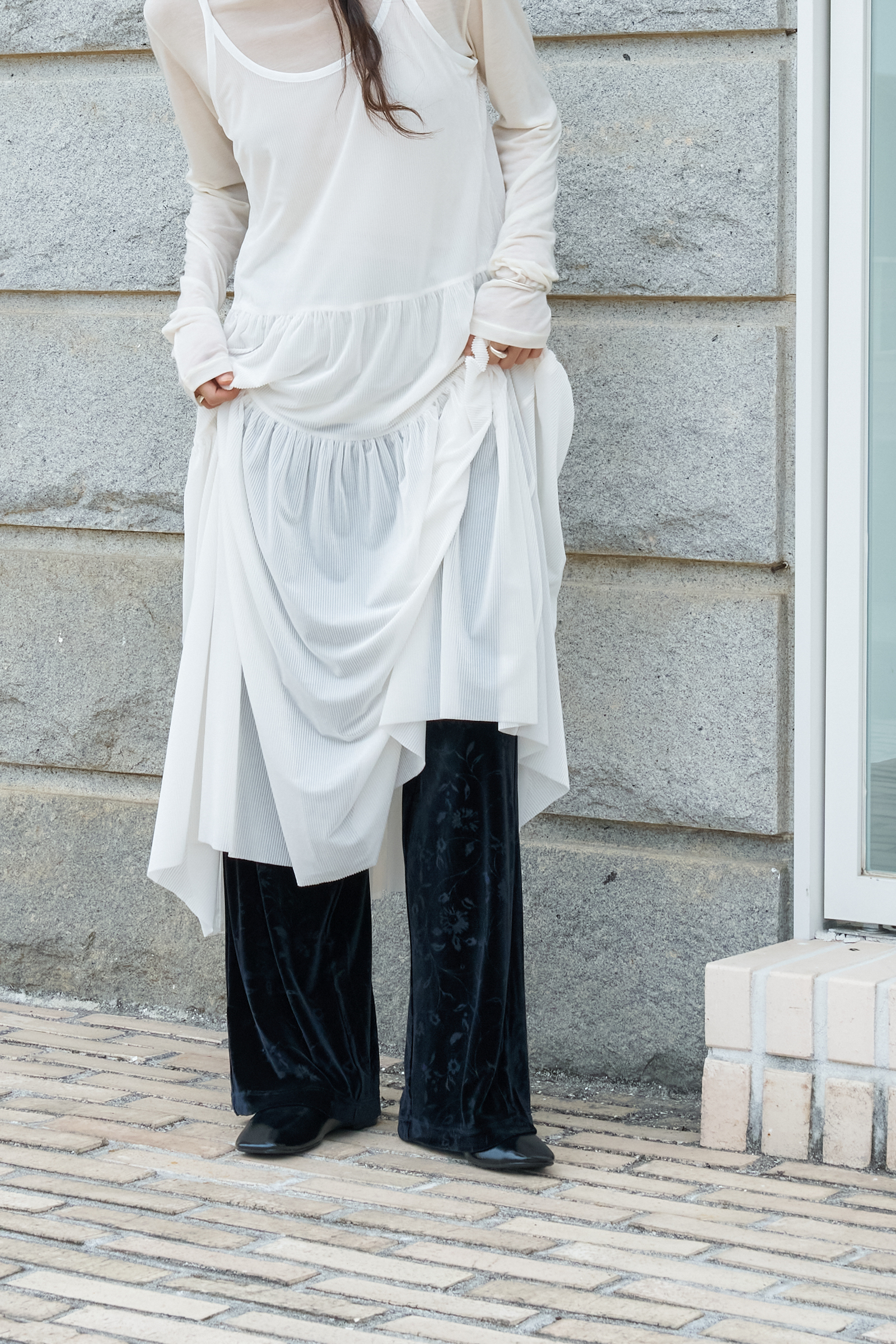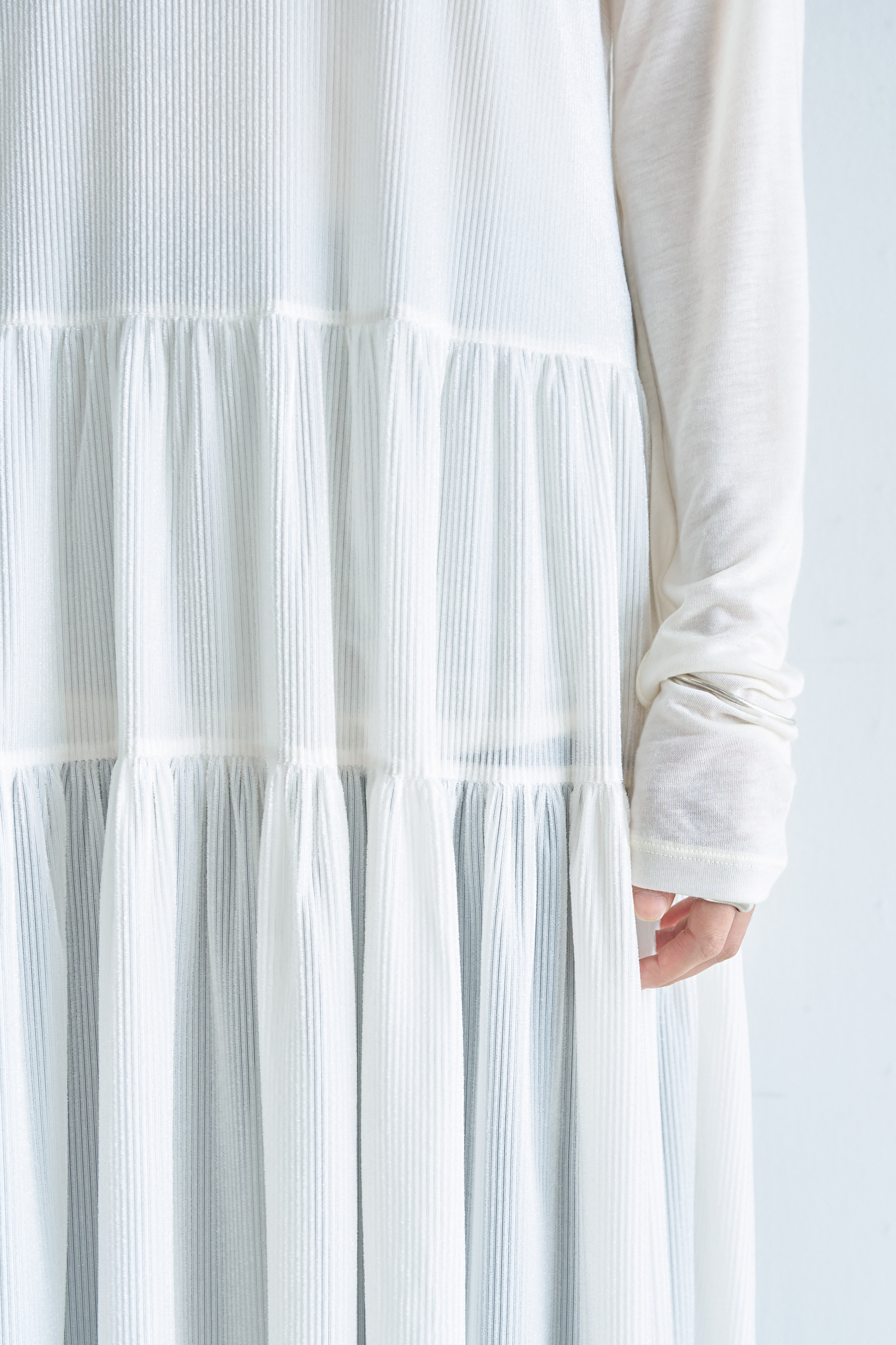 세로결을 따라 가공한 30데니아 리브 벨벳으로 만든 티어드 드레스입니다.