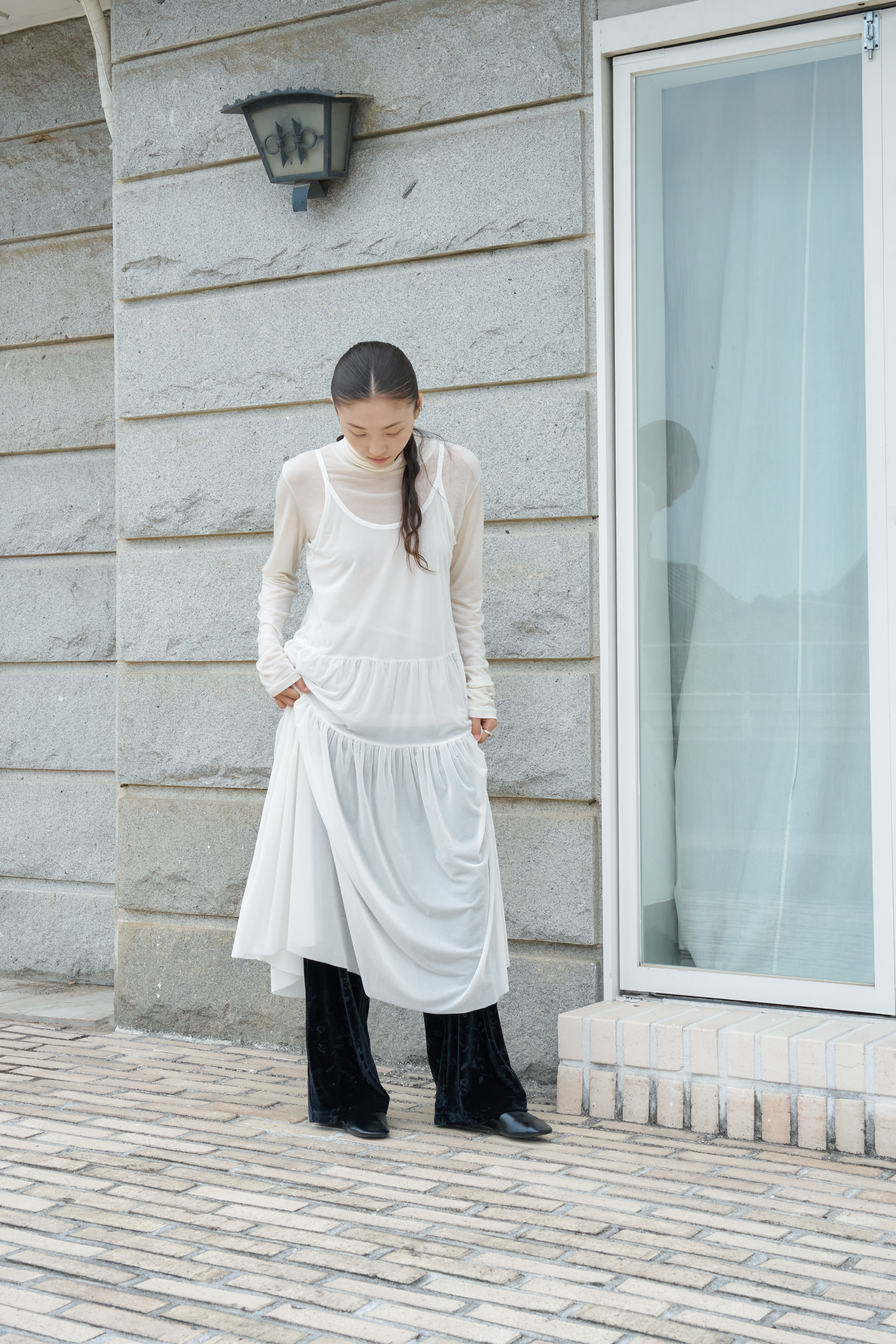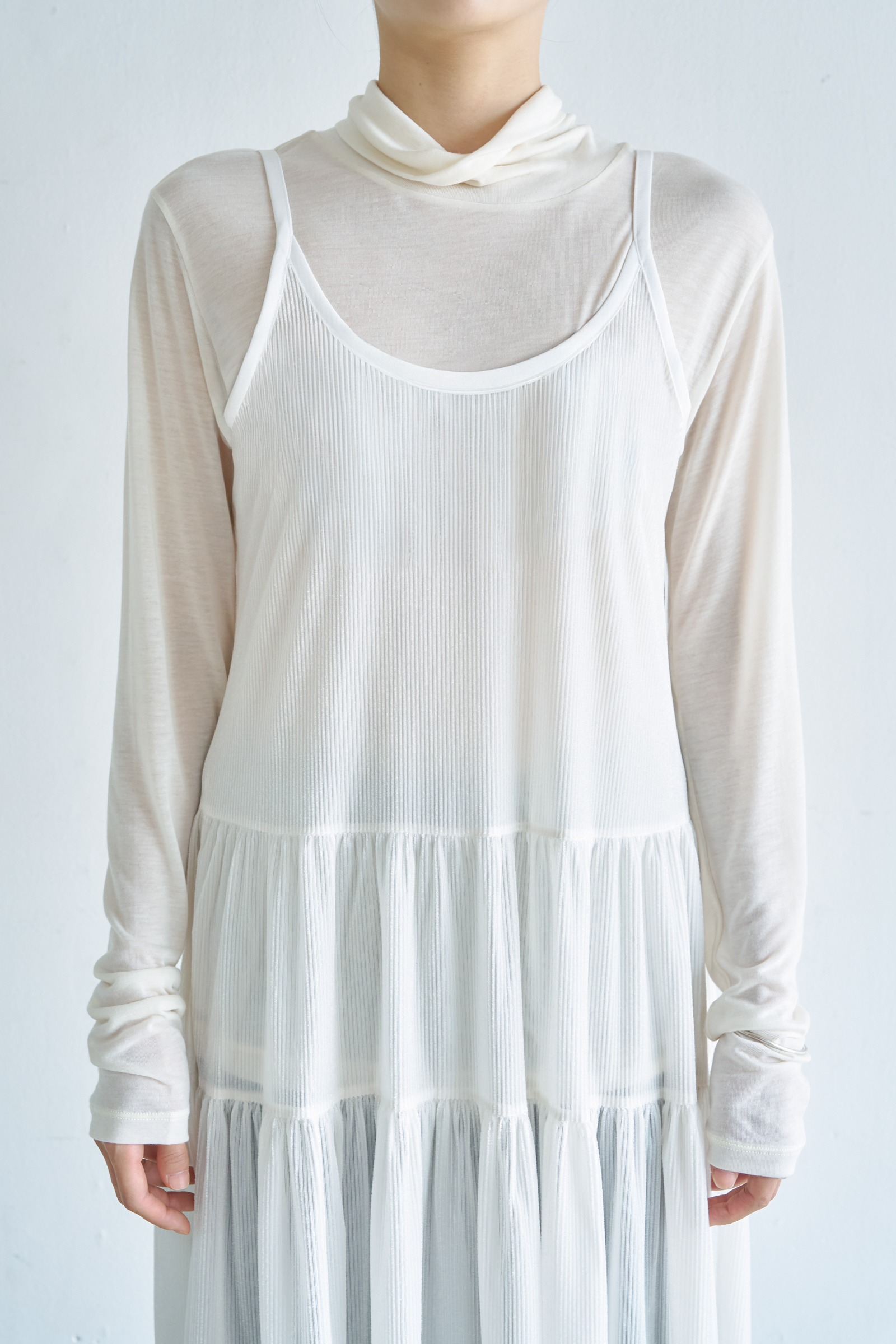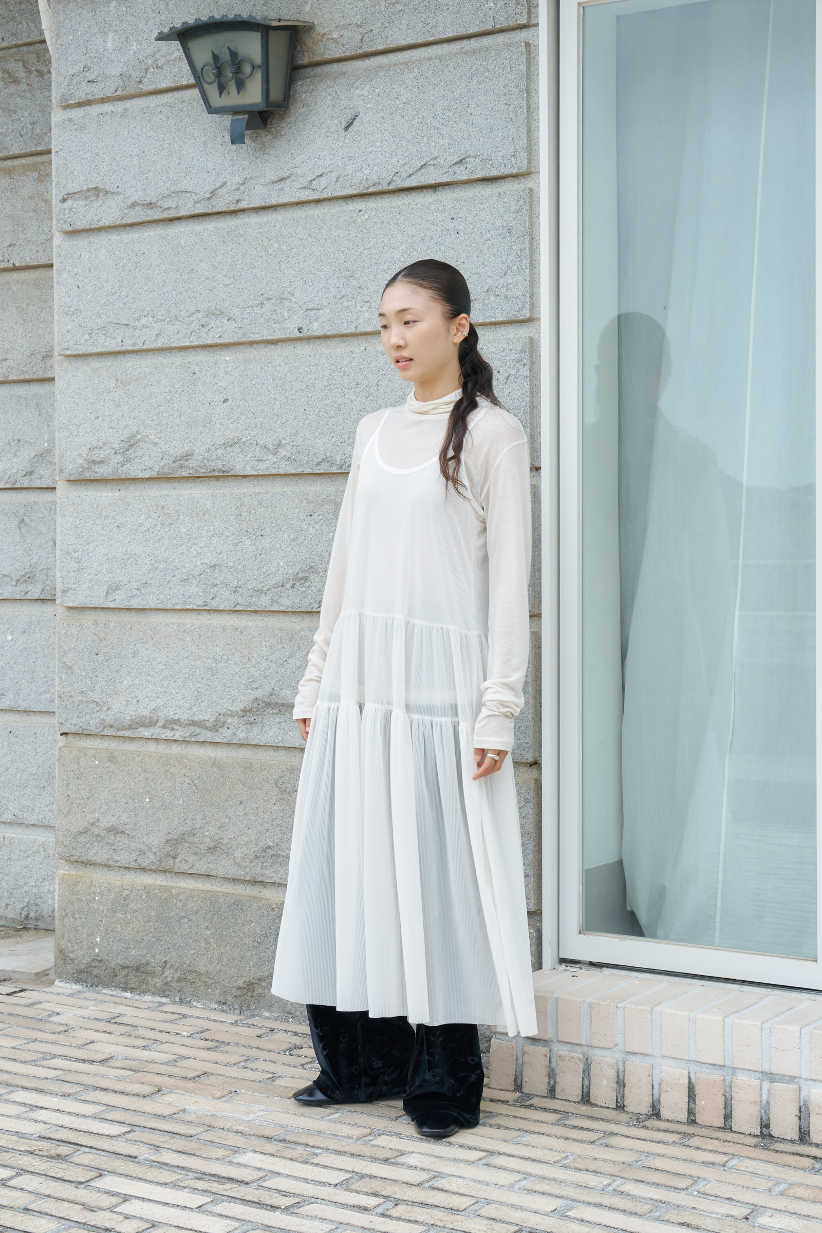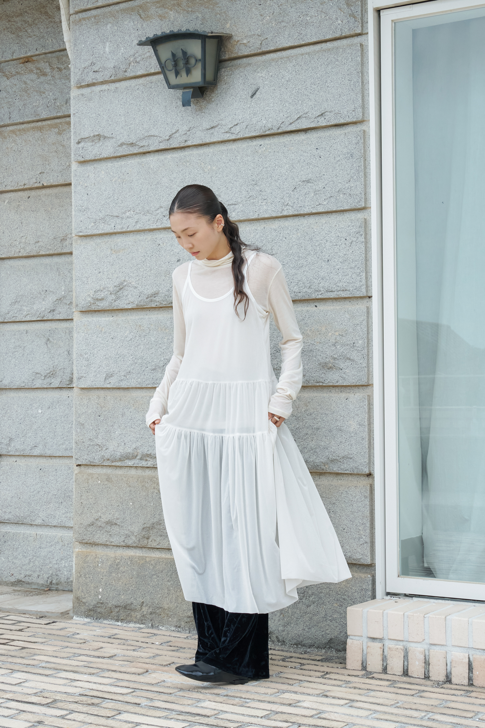 세로결을 따라 가공한 30데니아 리브 벨벳으로 만든 티어드 드레스입니다.