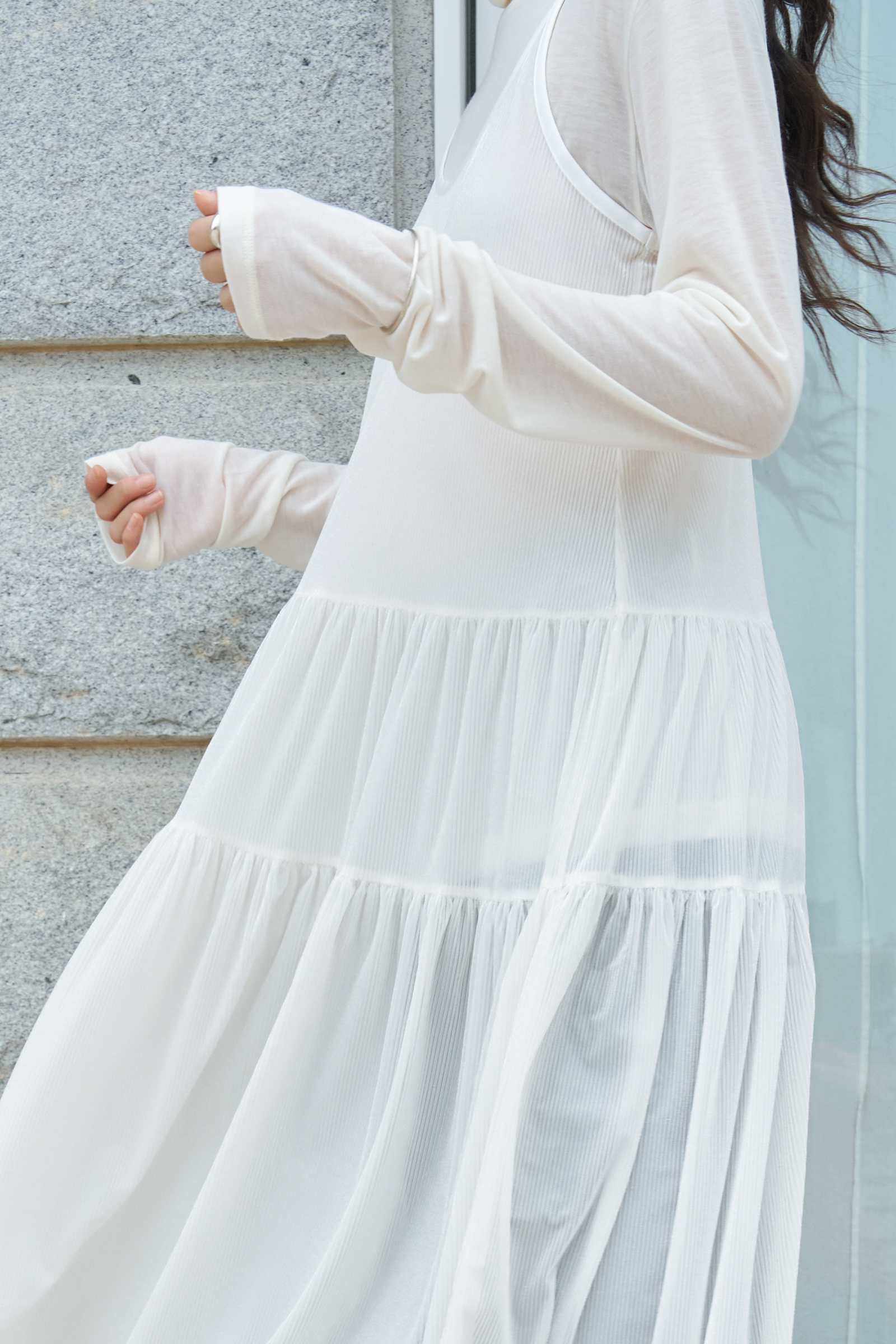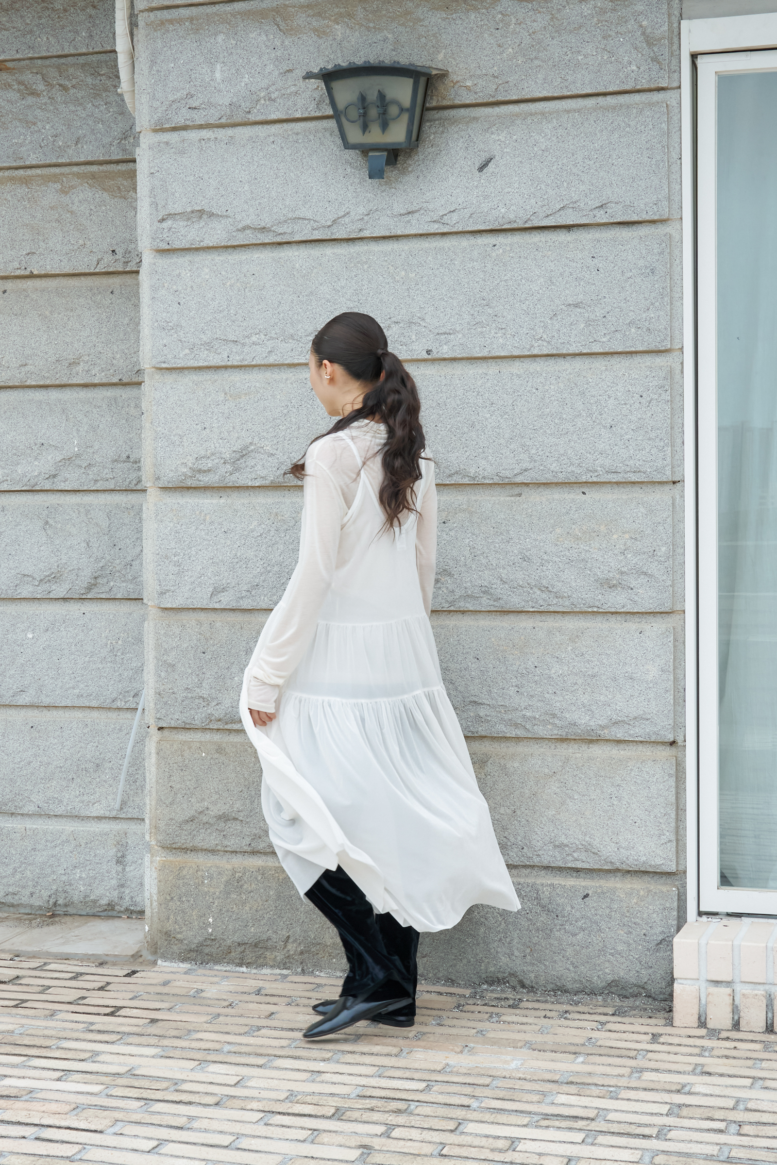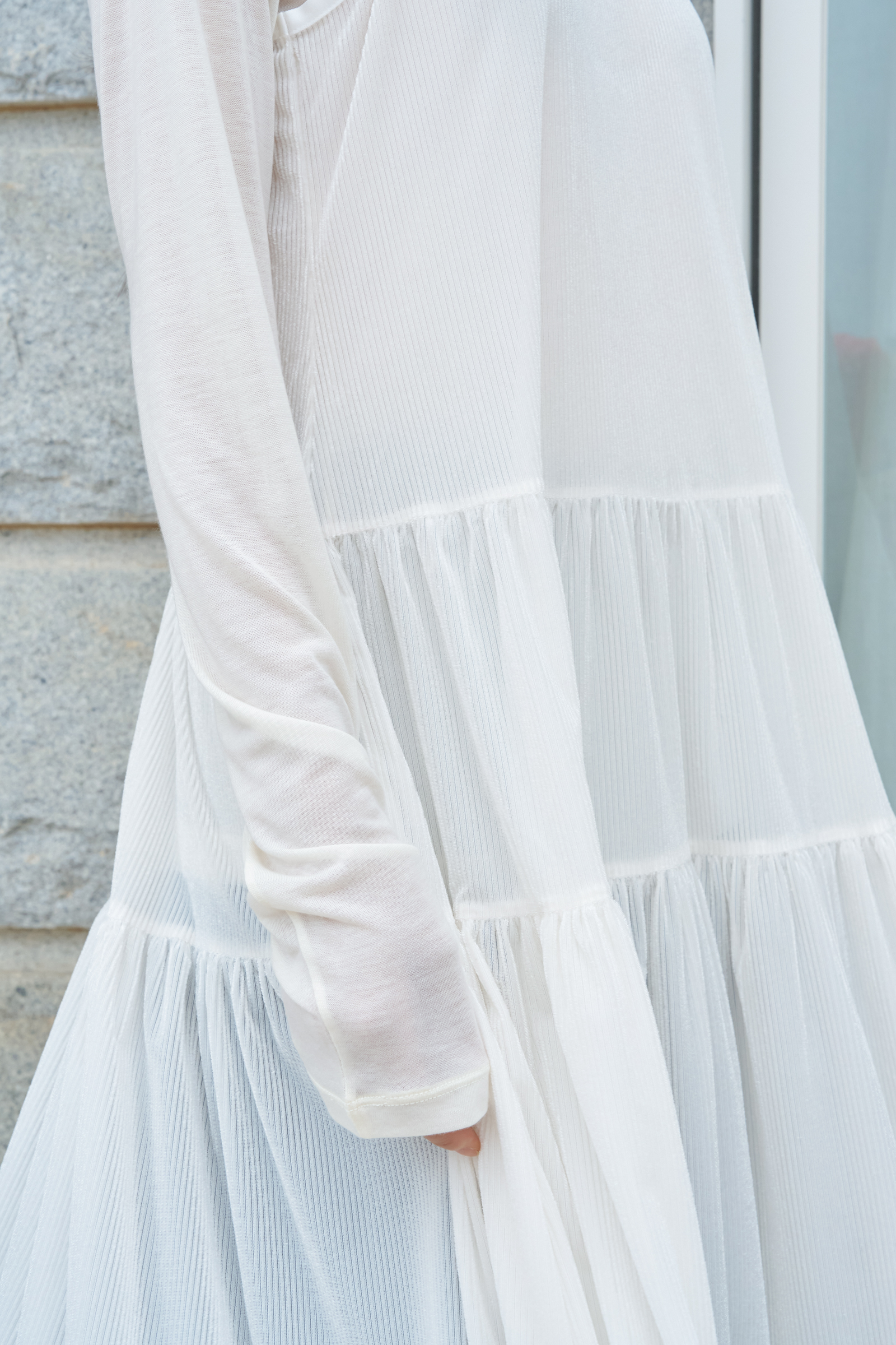 촘촘한 셔링이 만든 낭만적인 티어드 실루엣