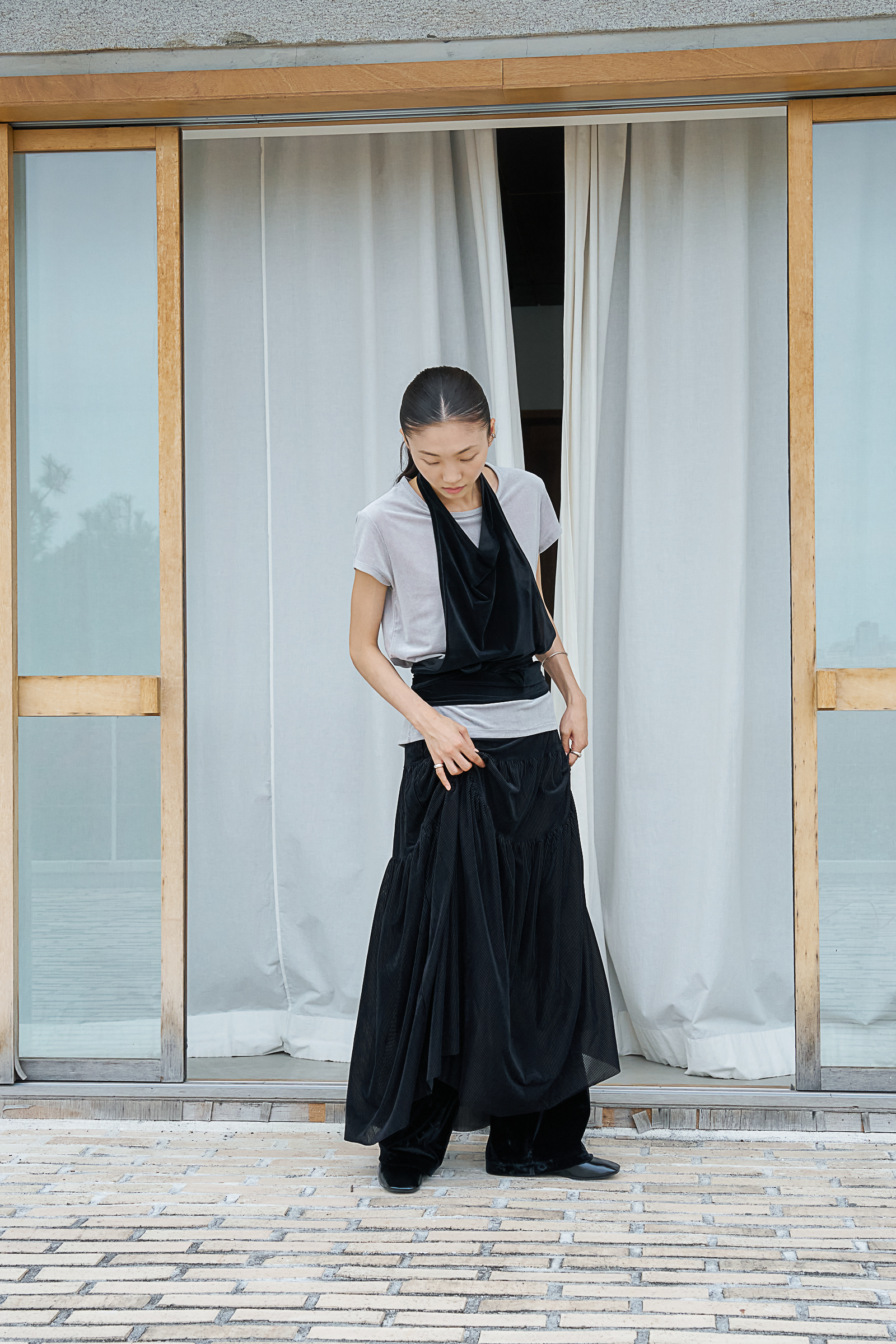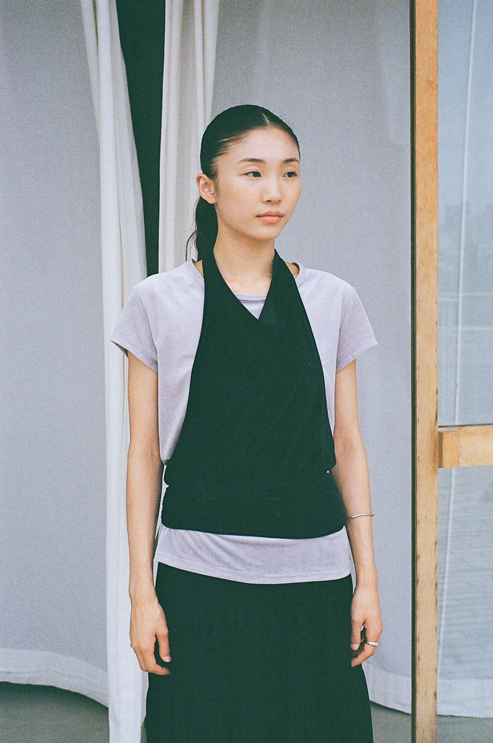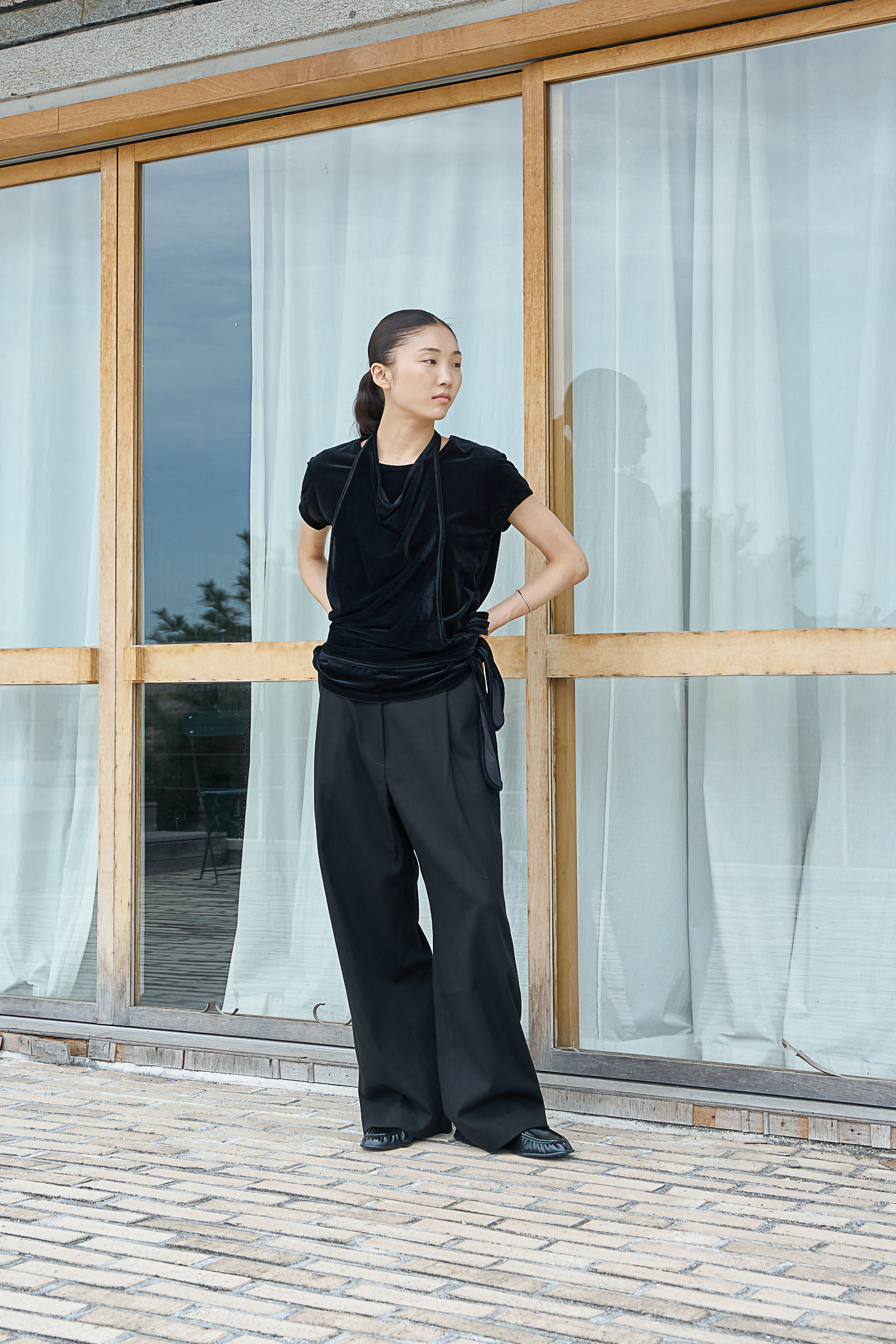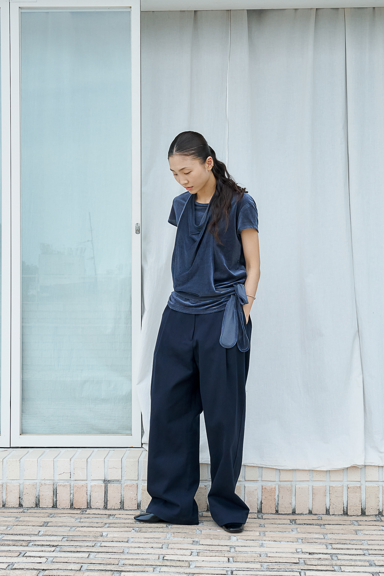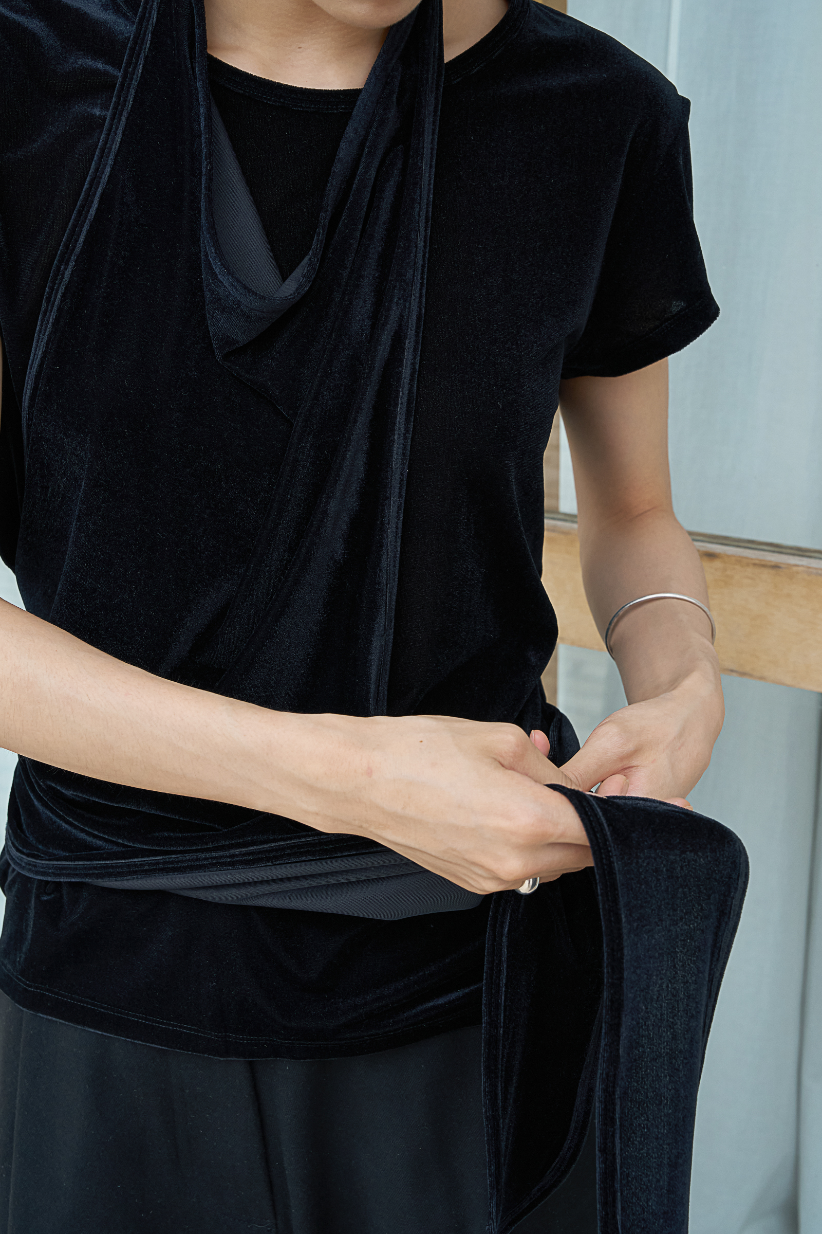 블랙 벨벳 특성상 이염이 있을 수 있습니다. 밝은 색 이너와 함께 착용하시기 전, 안심하고 입으실 수 있도록 2회 이상 단독 세탁해 주세요.