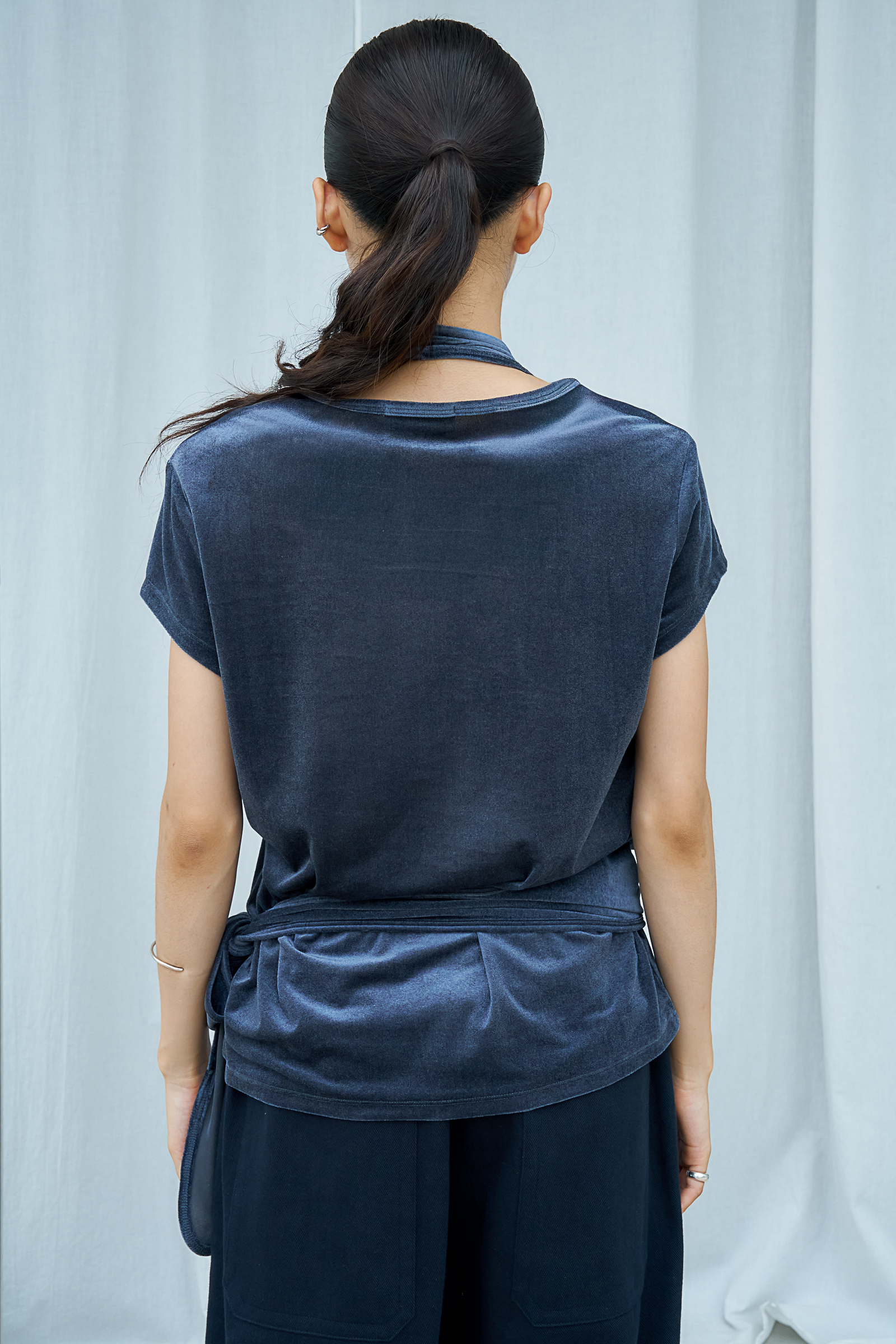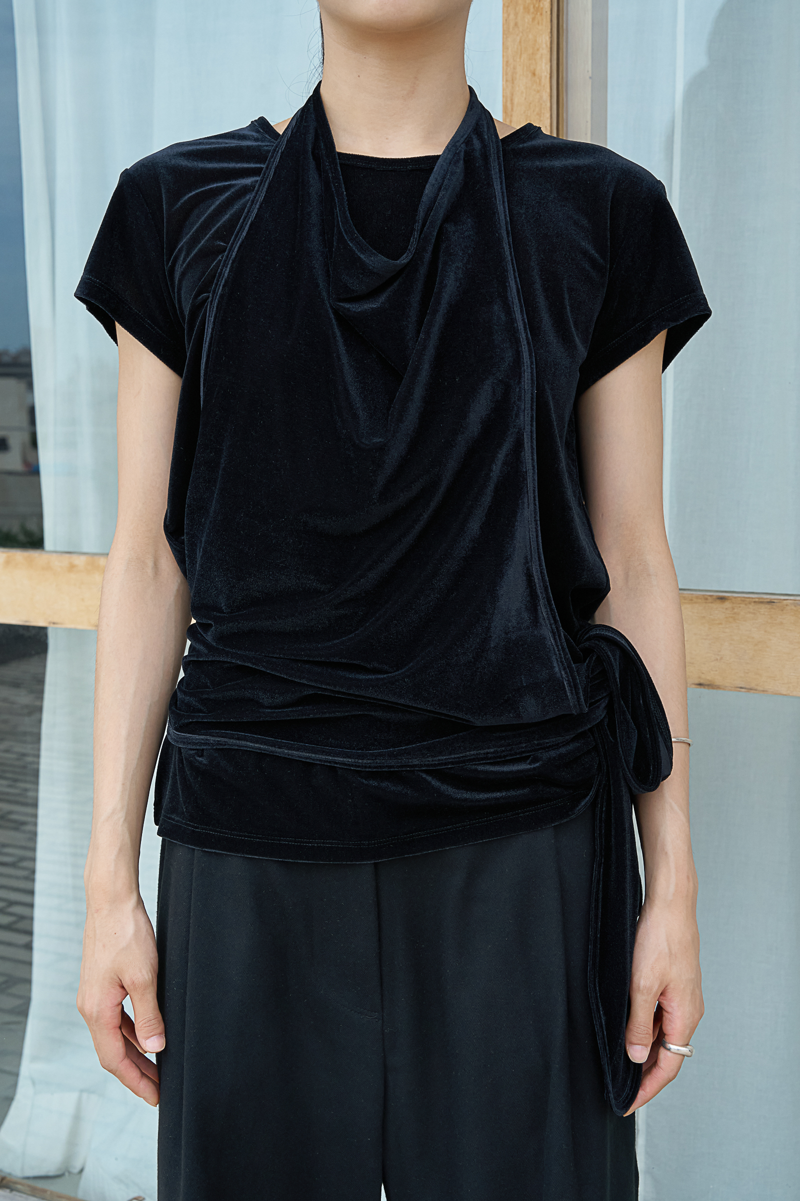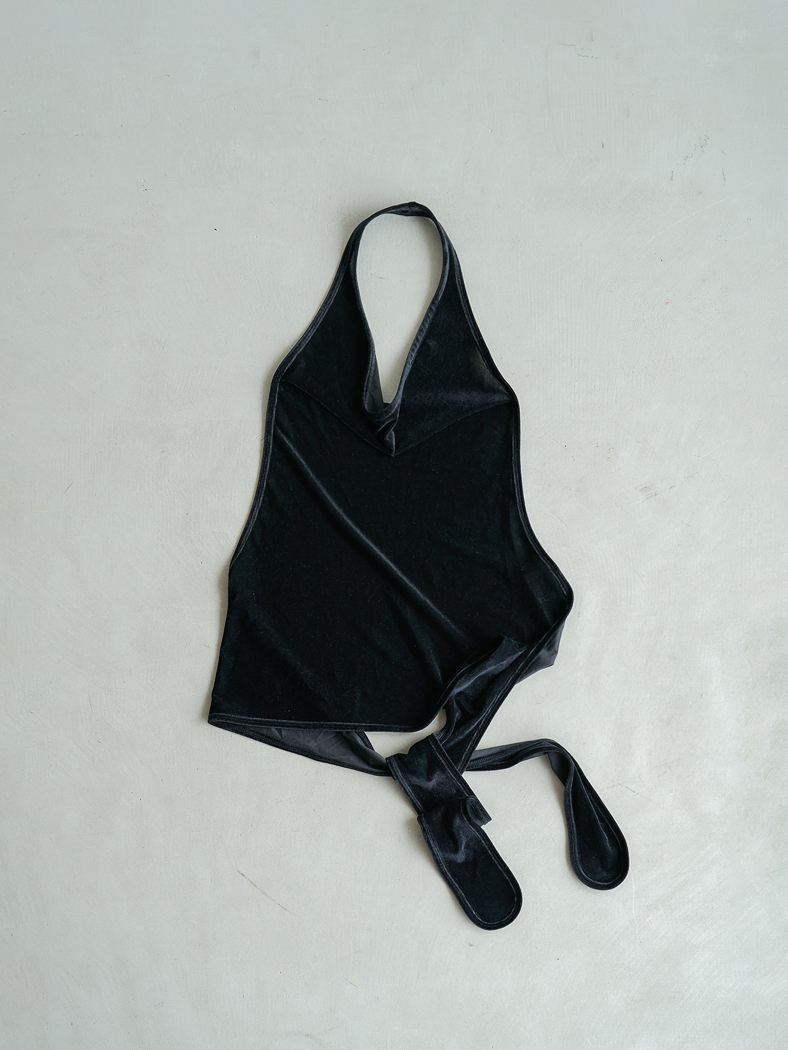 은은한 광택이 흐르는 30데니아 벨벳으로 완성한 타이 홀터 탑입니다.