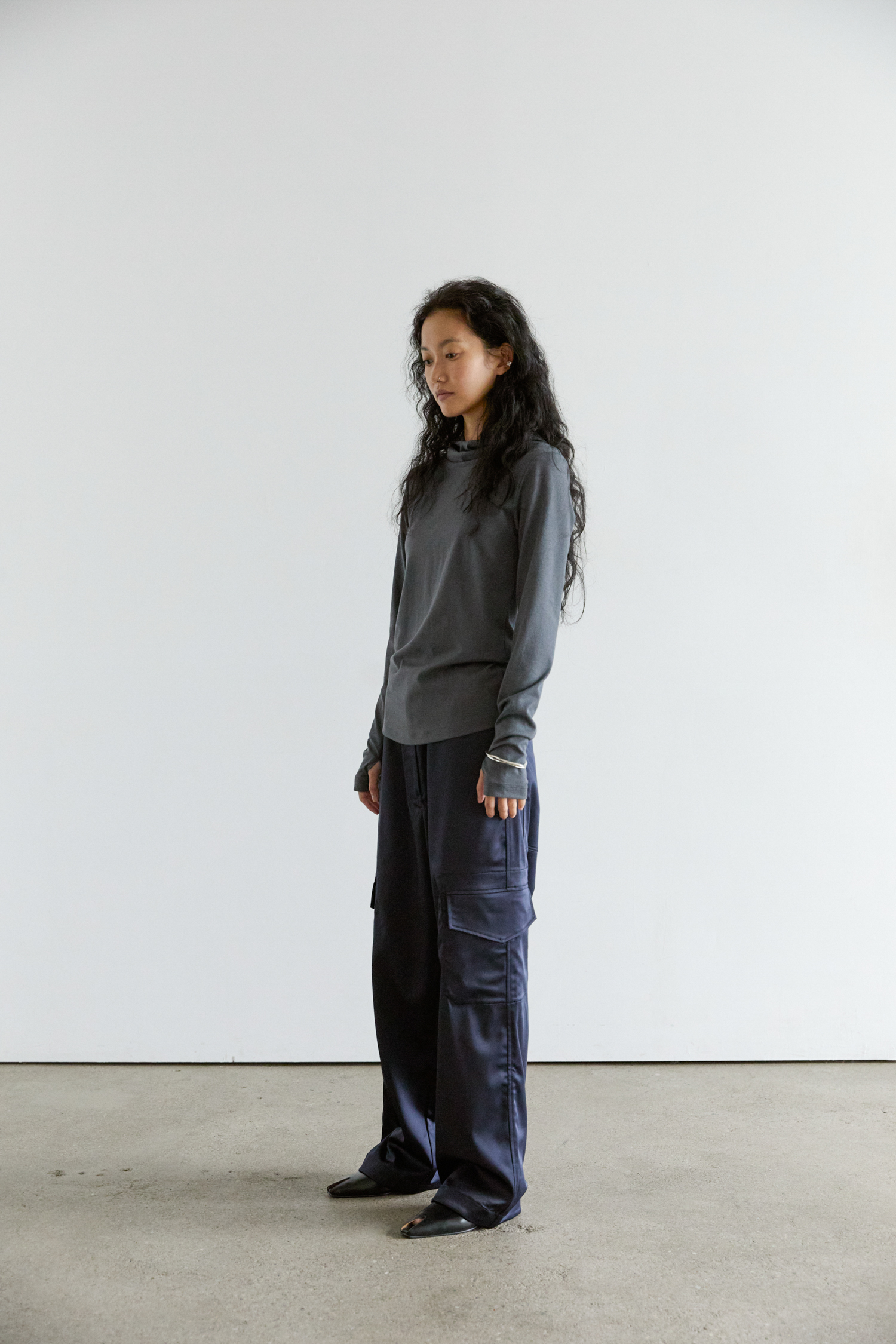 20. satin flap pocket banding pants (navy) — shop